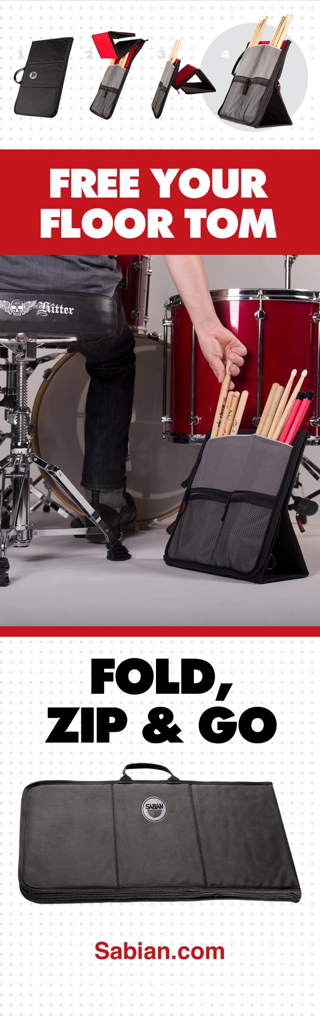 The versatile SABIAN Stick Flip starts out as a drumstick bag, then unzips, flips, and morphs into a drumstick holder – making transport a breeze!